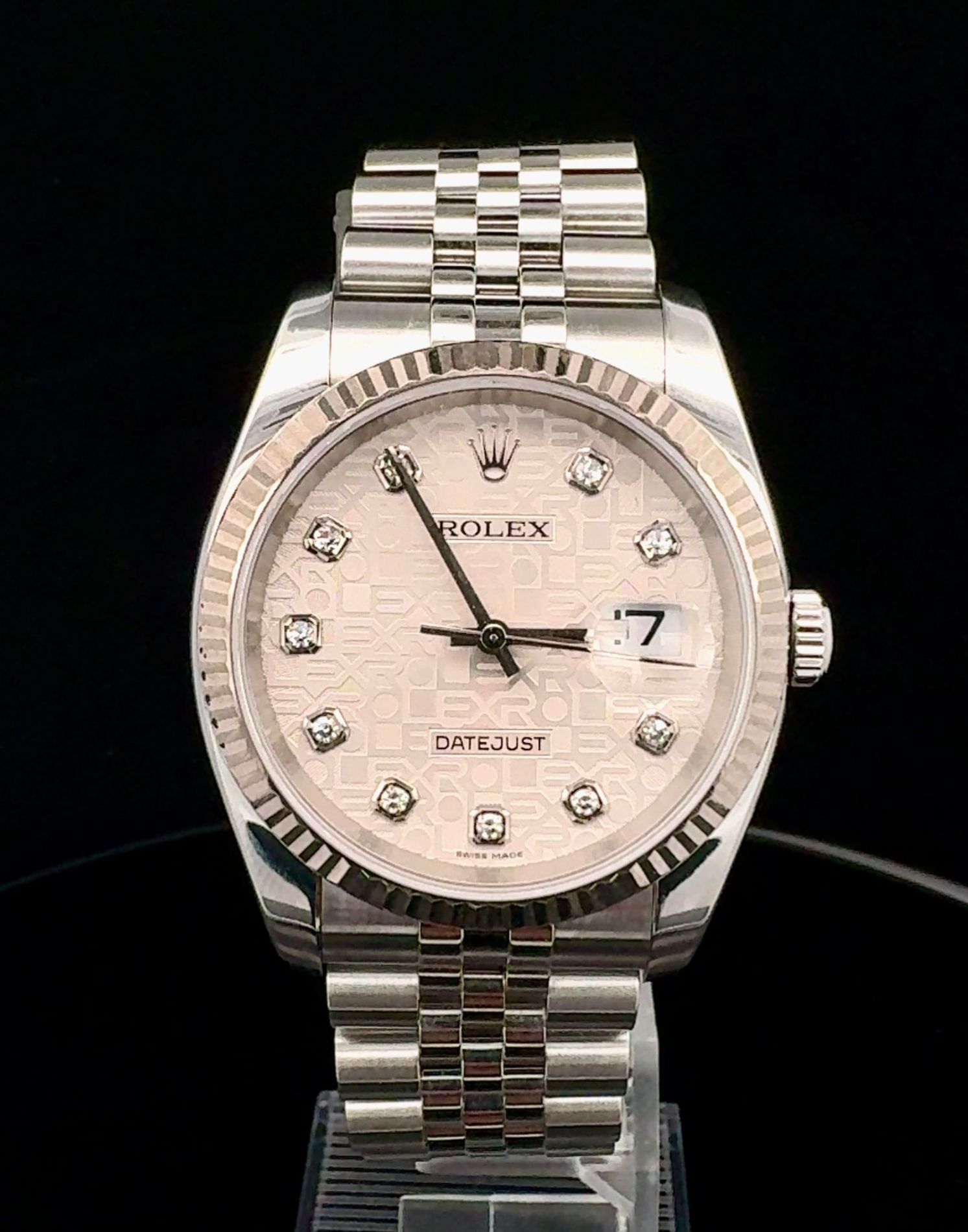 Marca Rolex Modello (Orologio) Datejust 36 Numero di referenza 116234 Carica Automatico Materiale della cassa Acciaio Materiale cinturino Acciaio Anno di produzione 2006 Condizione Usato (Ottimo) L'articolo presenta segni di usura lievi, come ad esempio graffi leggeri, ma non percepibili al tatto Corredo Con documenti originali, senza scatola originale Carica Automatico Cassa Materiale della cassa Acciaio Diametro 36 mm Impermeabile 10 ATM Materiale lunetta Oro bianco Vetro Vetro zaffiro Quadrante computer dial diamanti Cinturino Materiale cinturino Acciaio Colore cinturino Acciaio Materiale chiusura Acciaio Funzioni Data
