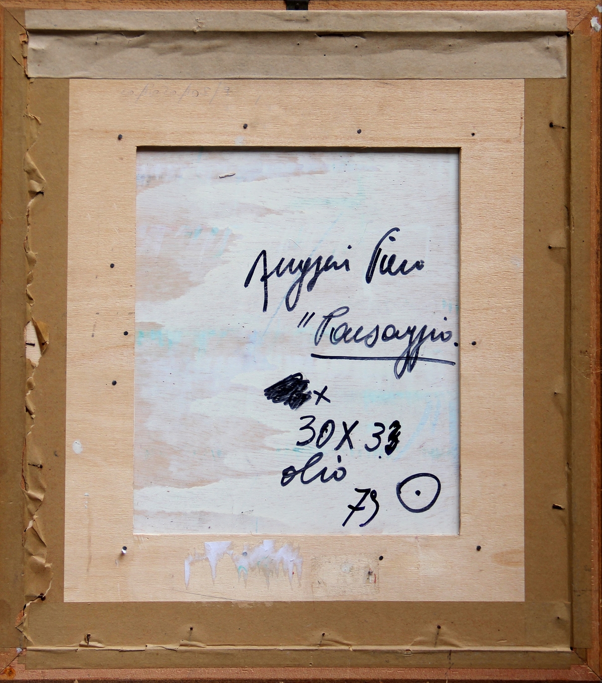 Firma, titolo, dimensioni, tecnica, data "Ruggeri Piero, Paesaggio, 30x33, olio, 79" (al retro)