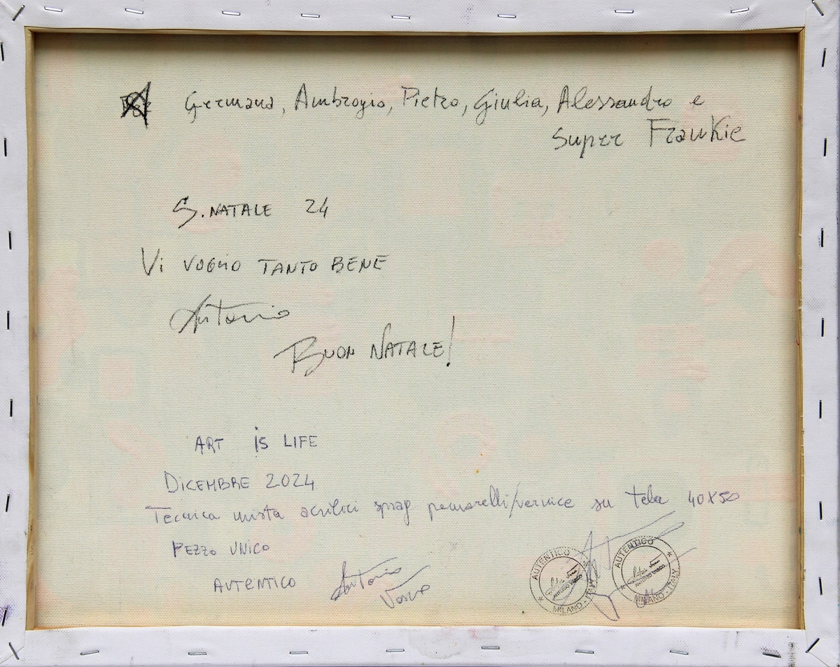 Dedica, titolo, data, tecnica, dimensioni, firma "Art is life, dicembre 2024, tecnica mista acrilici spray pennarelli vernice su tela, 40x50, Antonio Vasco";