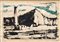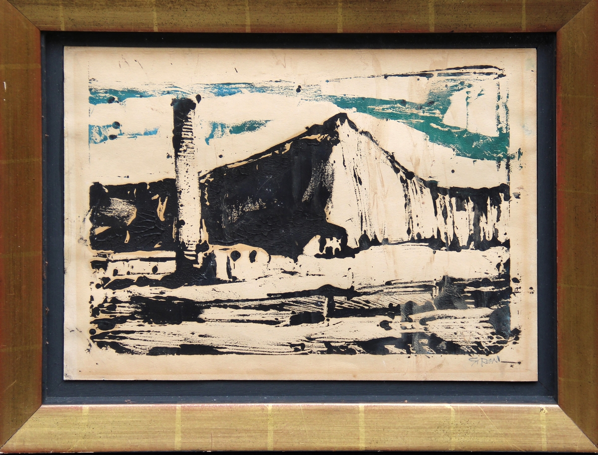 SIRONI Mario, Paesaggio con industria, 1951 circa, monotipo e tracce di tempera su carta applicata su cartone, cm 27,4x39,1