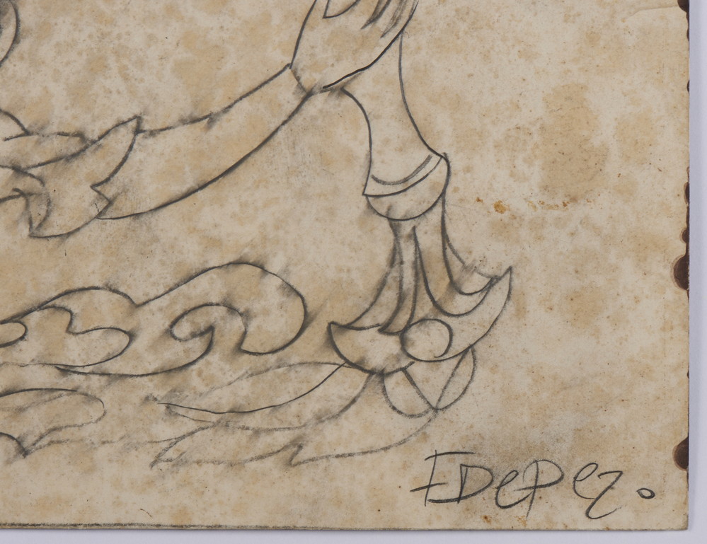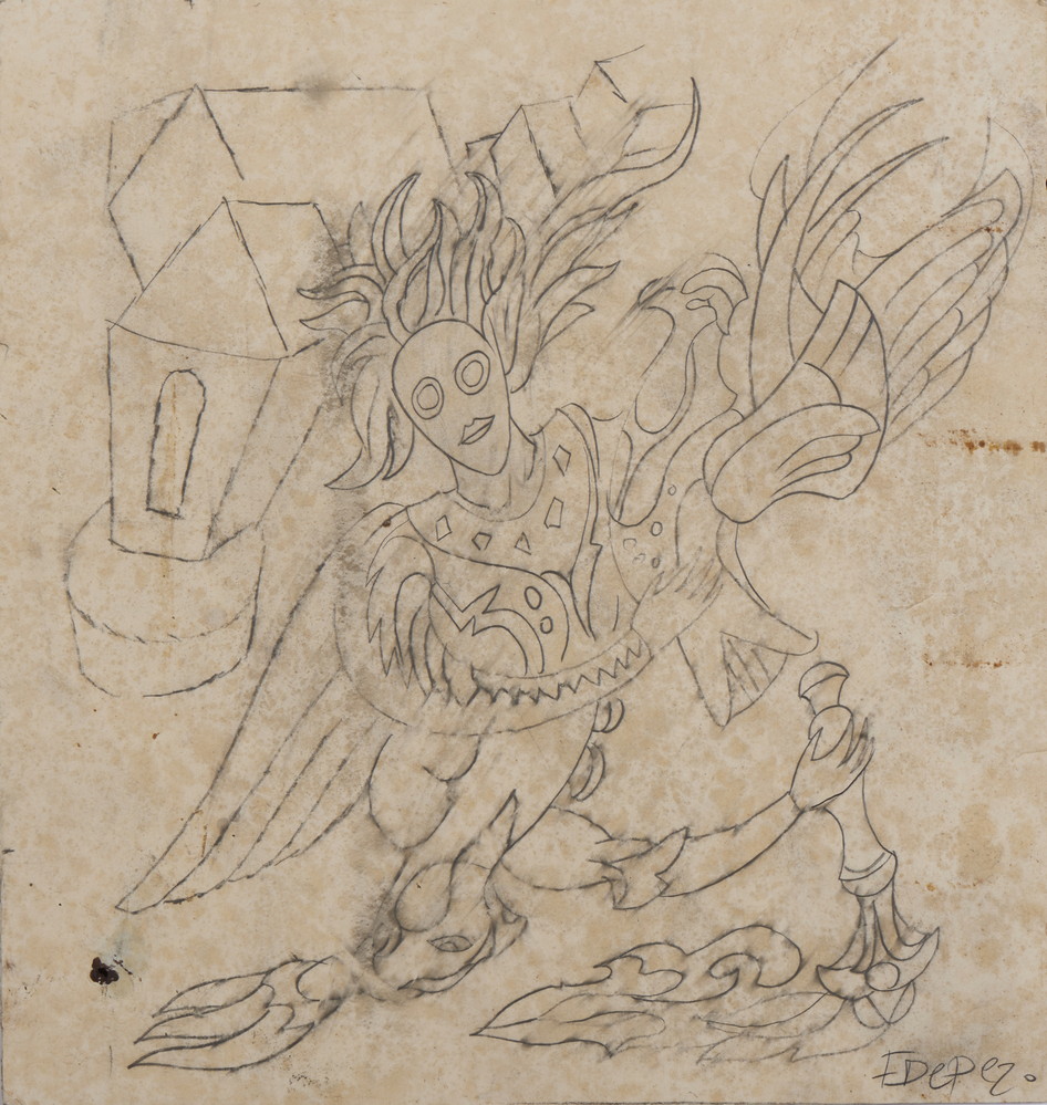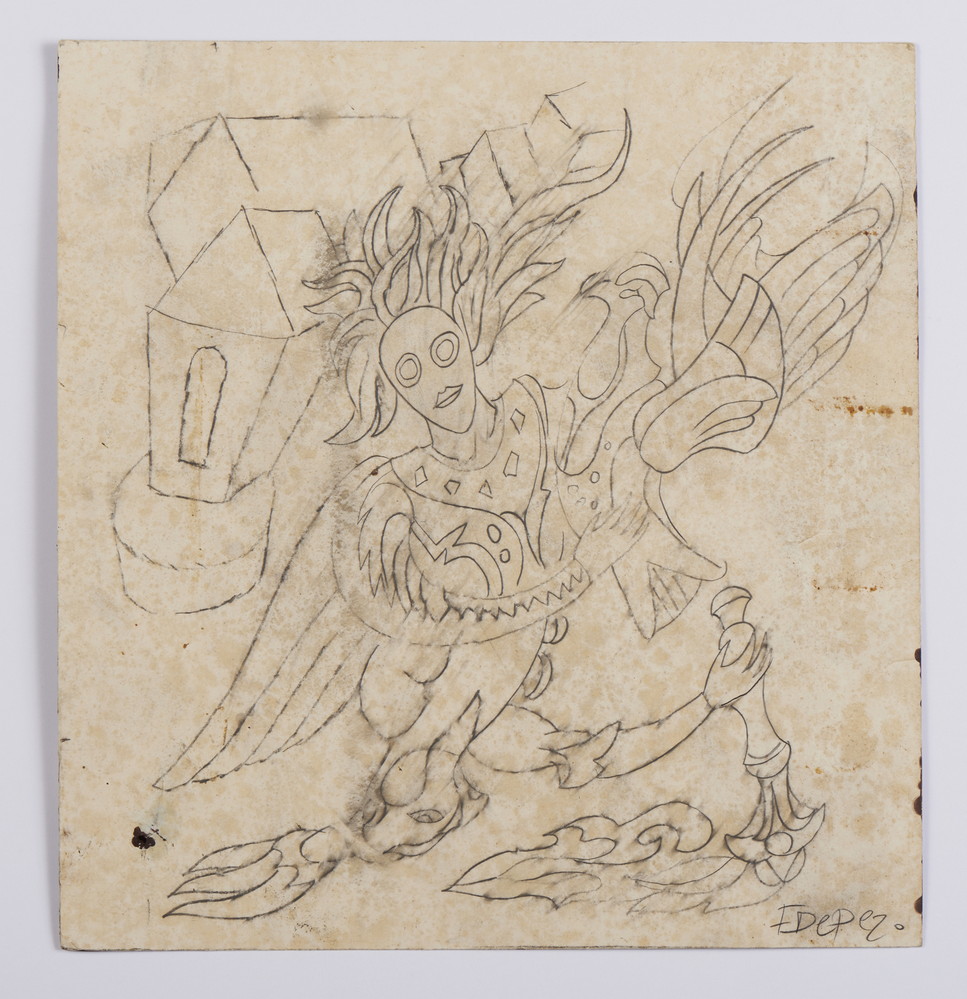 Realizzato durante il soggiorno newyorkese di Depero (1928-1930), questo disegno nasce nell’ambito della sua collaborazione con la rivista Atlantica (già Rivista d'Italia e d'America), testimone della sua inesauribile creatività nel mondo dell’editoria e della grafica. Il soggetto è una figura alata che tiene tra le mani un uccello leggendario, evocando atmosfere fiabesche e suggestioni legate ai personaggi magici dei boschi. Un richiamo che potrebbe riportare proprio ai paesaggi boschivi alpini di Serrada, tanto cari all’artista. Sullo sfondo, in effetti, essenziale e iconica, Scudiero riconosce la chiesa del paese: un dettaglio che riconnette Depero alle sue radici, tra modernità e memoria.
