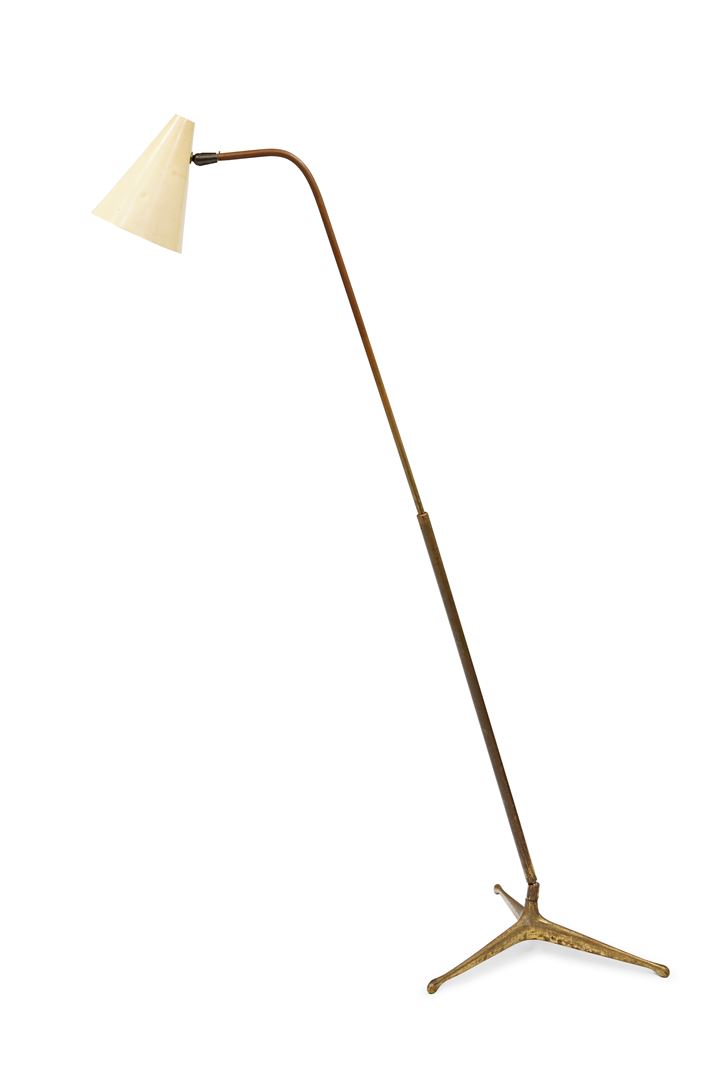 Lampada da terra base e fusto telescopico in ottone, diffusore orientabile in alluminio laccato.