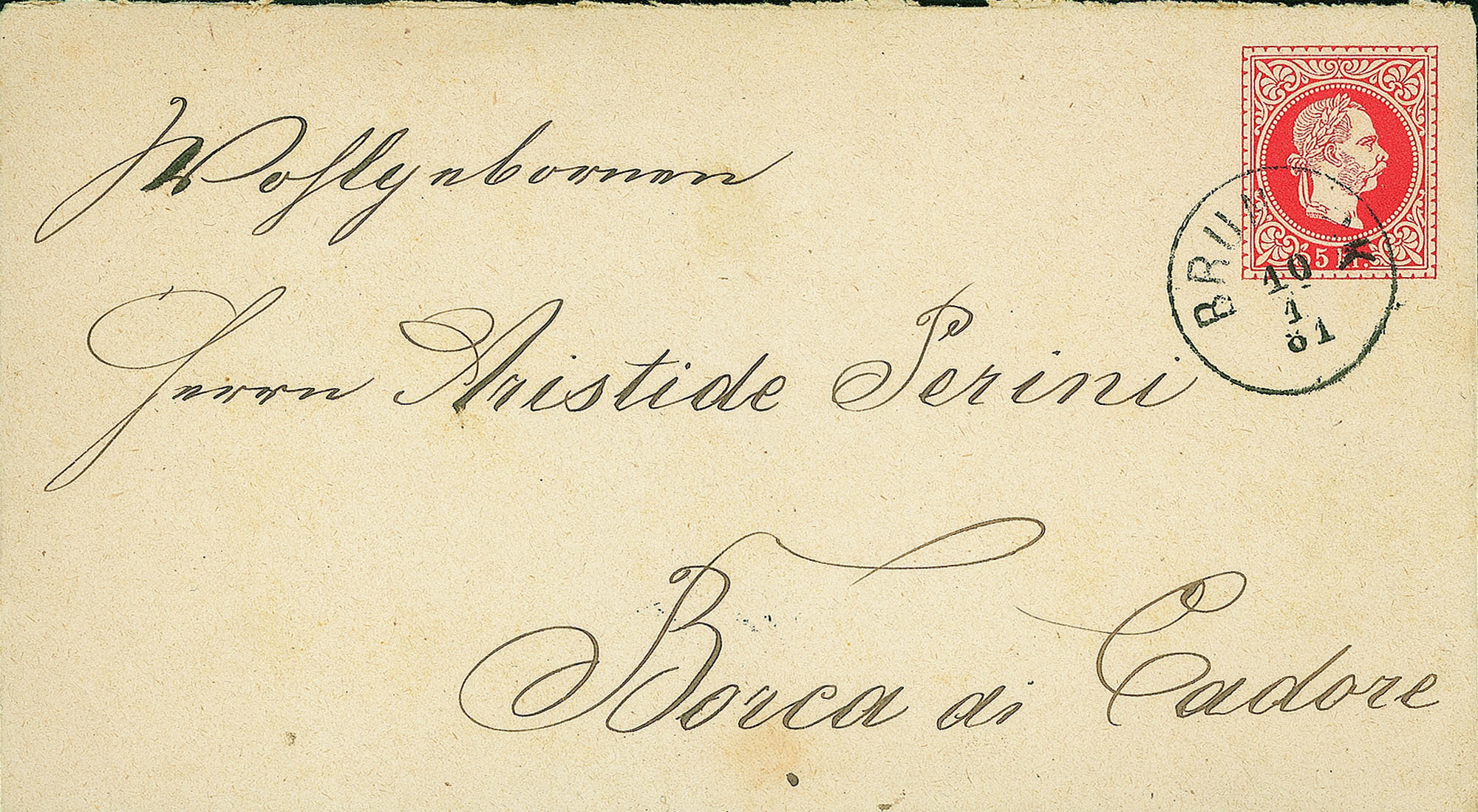 Antichi Stati Italiani - Lombardo Veneto - Territori Italiani d'Austria - KK Fahrendes Postamt N. 31 (linea Mariborg Fortezza)Su 5 kreuzer (37/II) applicato al retro di busta postale da 5 kreuzer da Brunico a Borca (di Cadore) del 10.1.1881 - cert. Sottoriva