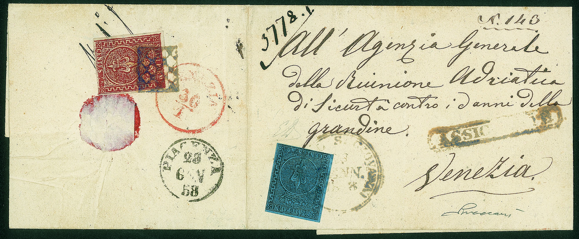 Antichi Stati Italiani - Parma - Lettera per Venezia con 40 cent azzurro annullo d.c. Castel S. Giovanni 28 genn. 1858Con a lato il bollo in cartella Assicurato e al verso il 25 cent bruno rosso della seconda emissione con annullo a griglietta per assolvere il diritto di raccomandazione - due sole raccomandate note da questo ufficio postale - cert. dettagliato Vaccari