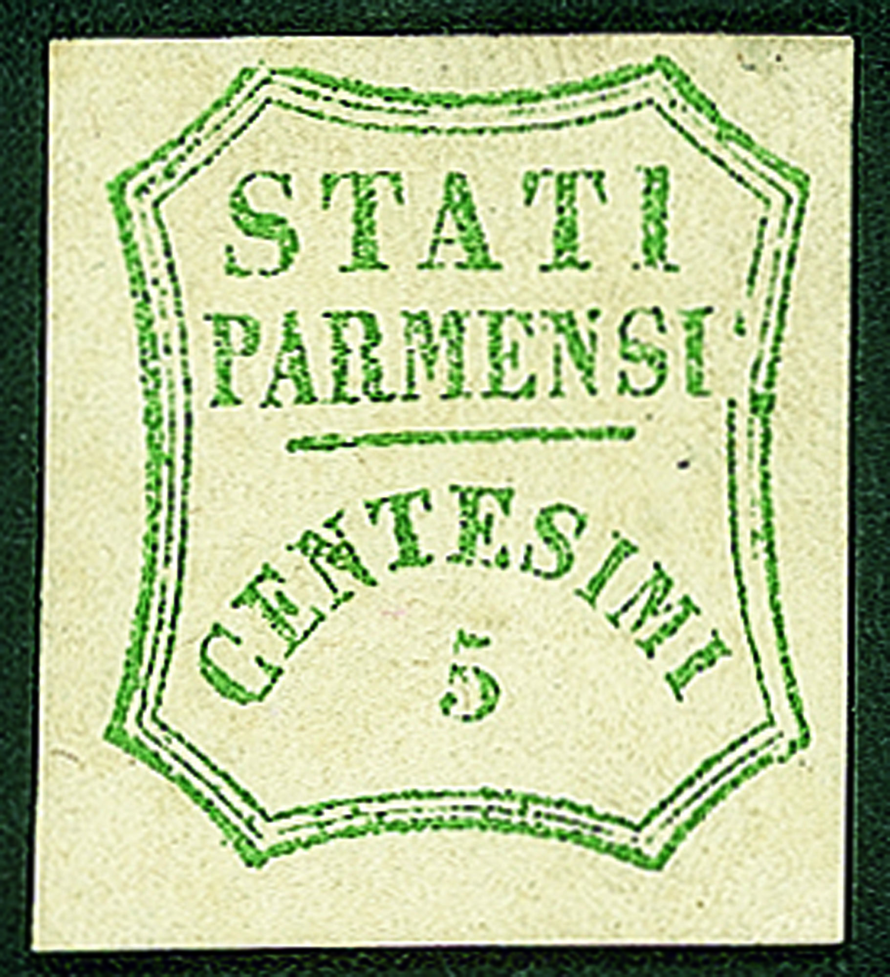 Antichi Stati Italiani - Parma - Governo Provvisorio - 1859 - 5 cent verde azzurro (12)Nuovo senza gomma - difetto di clichè sulla cornice destra - Raybaudi