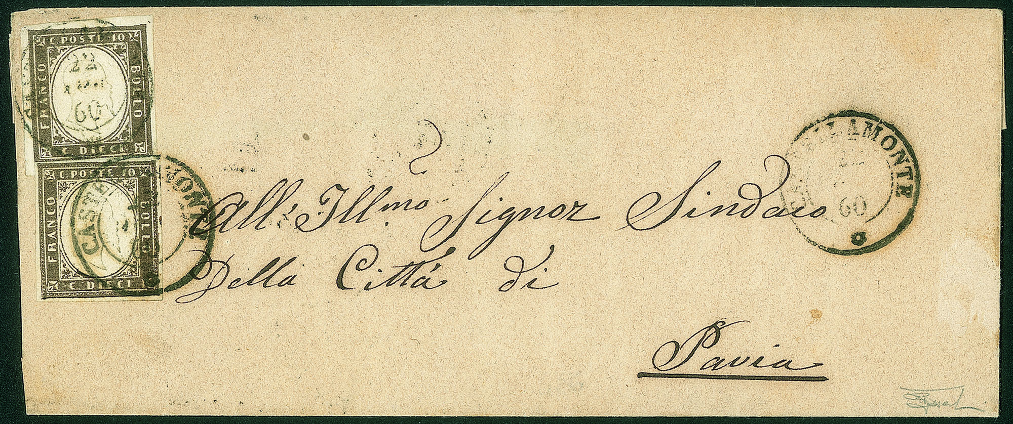 Antichi Stati Italiani - Sardegna - Lettera da Castellamonte 22 apr. 60 per PaviaCon due esemplari 10 cent bruno olivastro scuro (14Be) - cert. Bottacchi