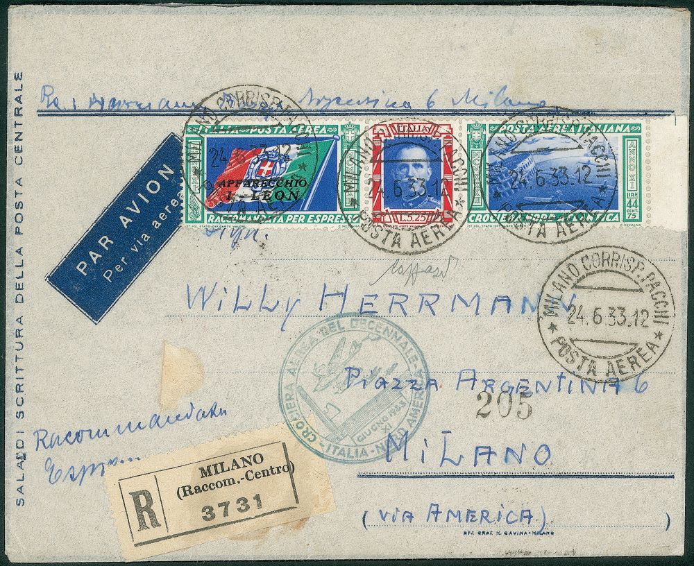 Regno - Vittorio Emanuele III - 1933 - Crociera Aerea del DecennaleAerogramma raccomandato da Milano a Milano affrancato con trittico I-LEON (A52H) - cert. Caffaz