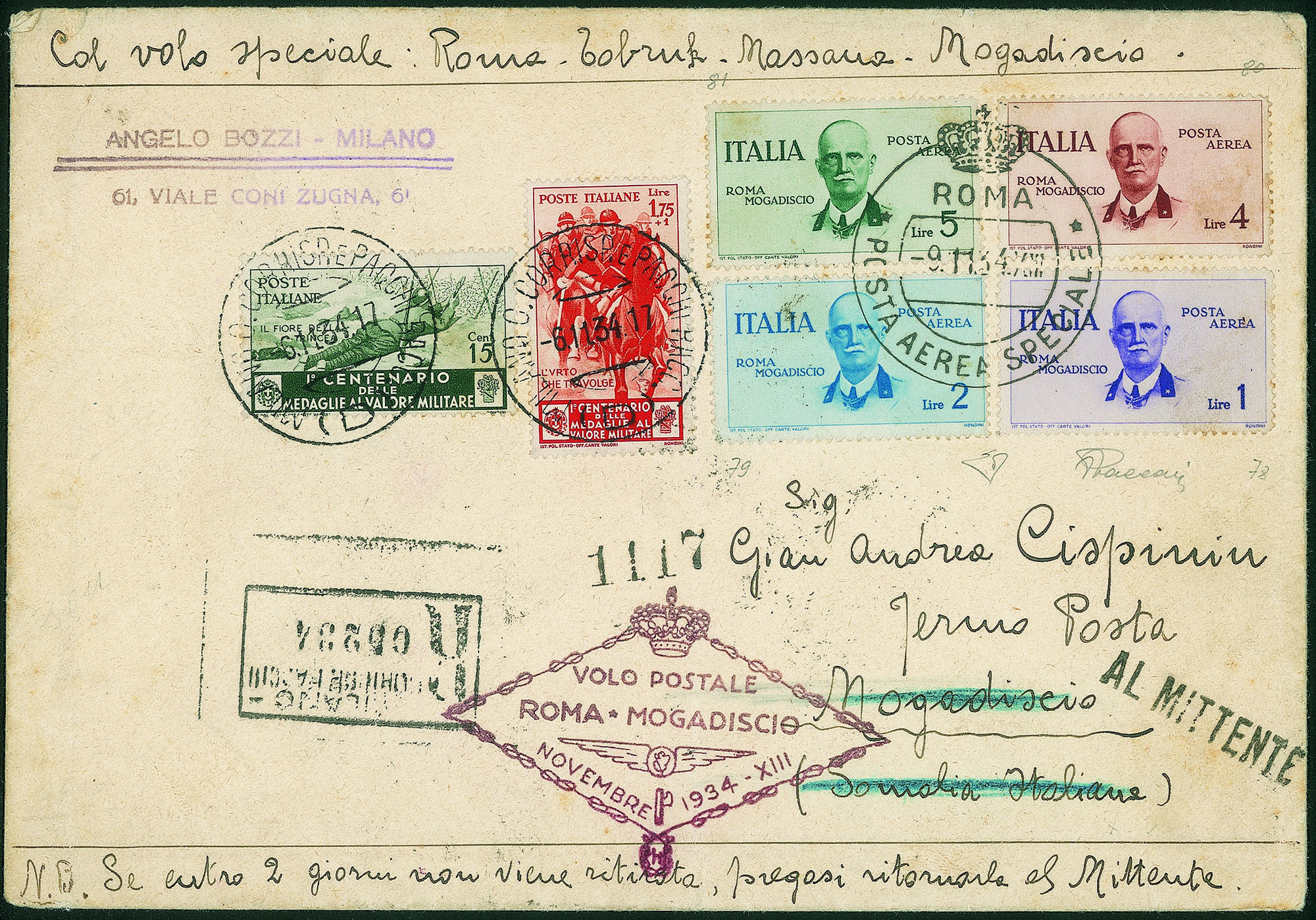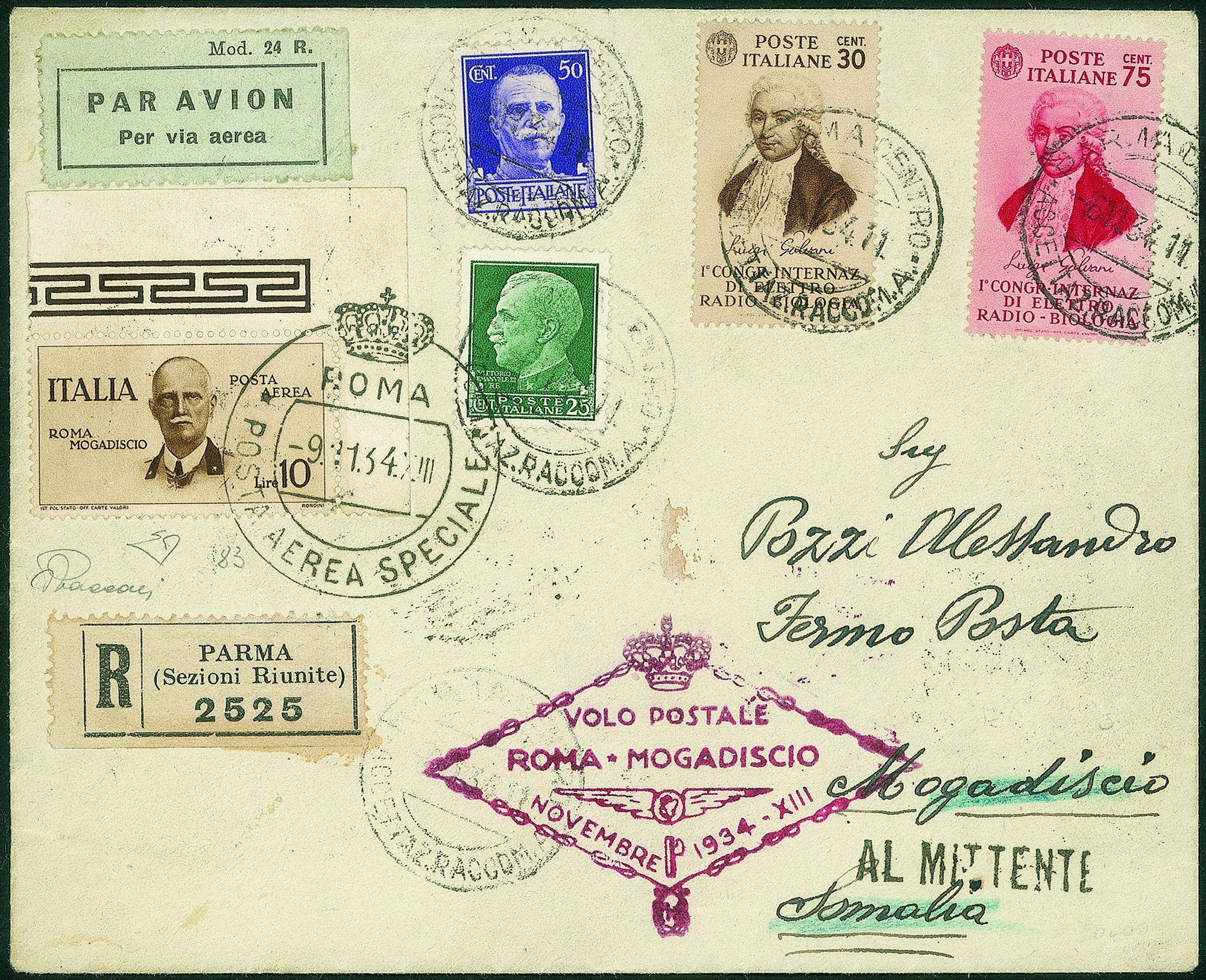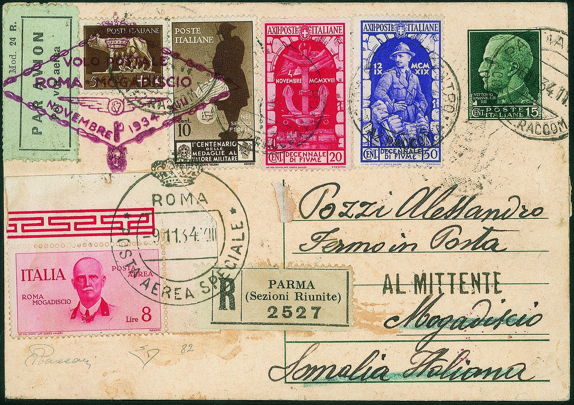 Regno - Vittorio Emanuele III - 1934 - Volo Roma MogadiscioLa serie completa di Posta Aerea su due aerogrammi ed una cartolina (A83/88) - tutte con firme ED e Vaccari