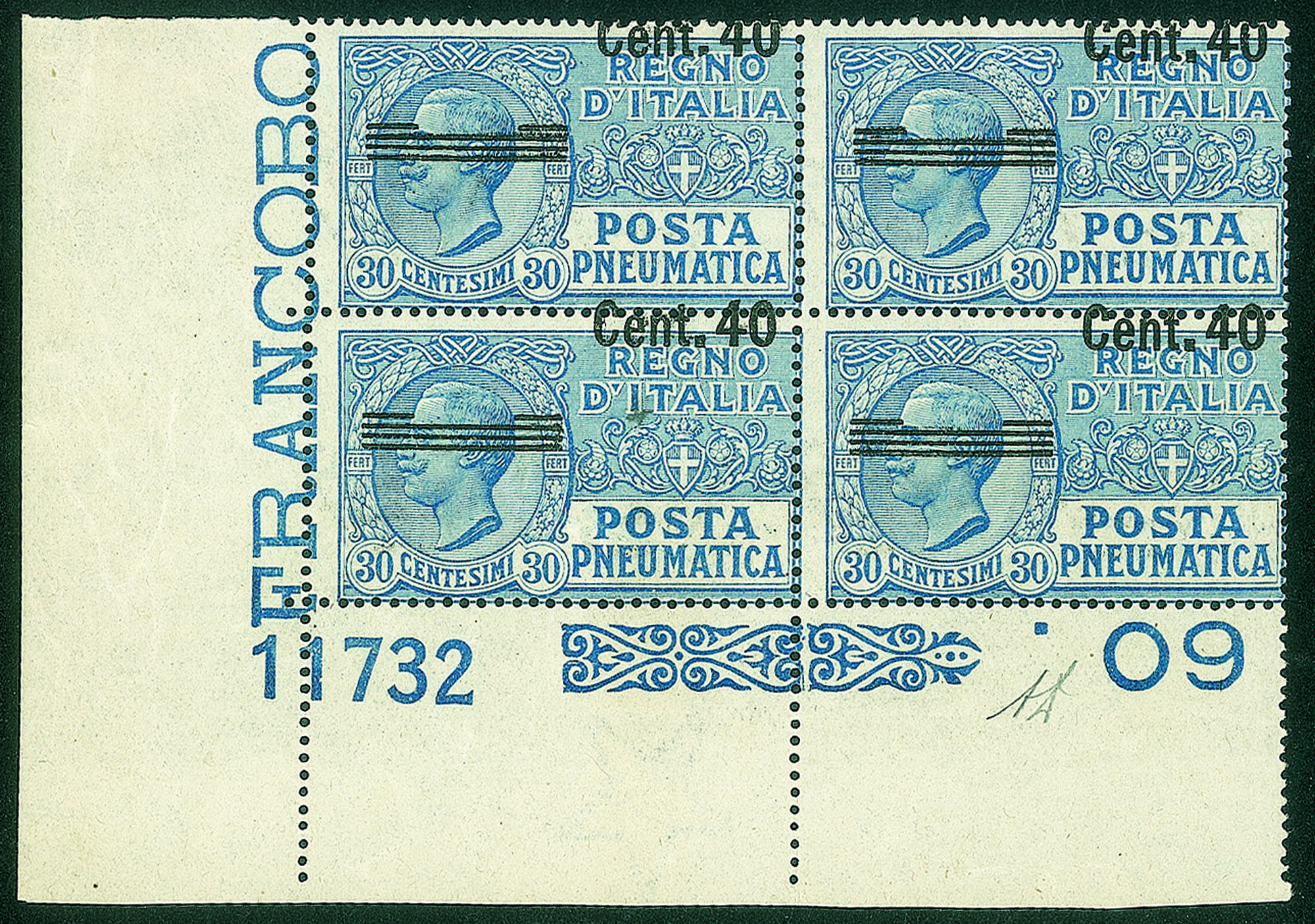 Regno - Vittorio Emanuele III - 1924/1925 - Posta Pneumatica - 40 cent Leoni su 30 cent azzurro in quartina (7c)Con soprastampa fortemente spostata in alto angolo di foglio con numero 11732 - AD
