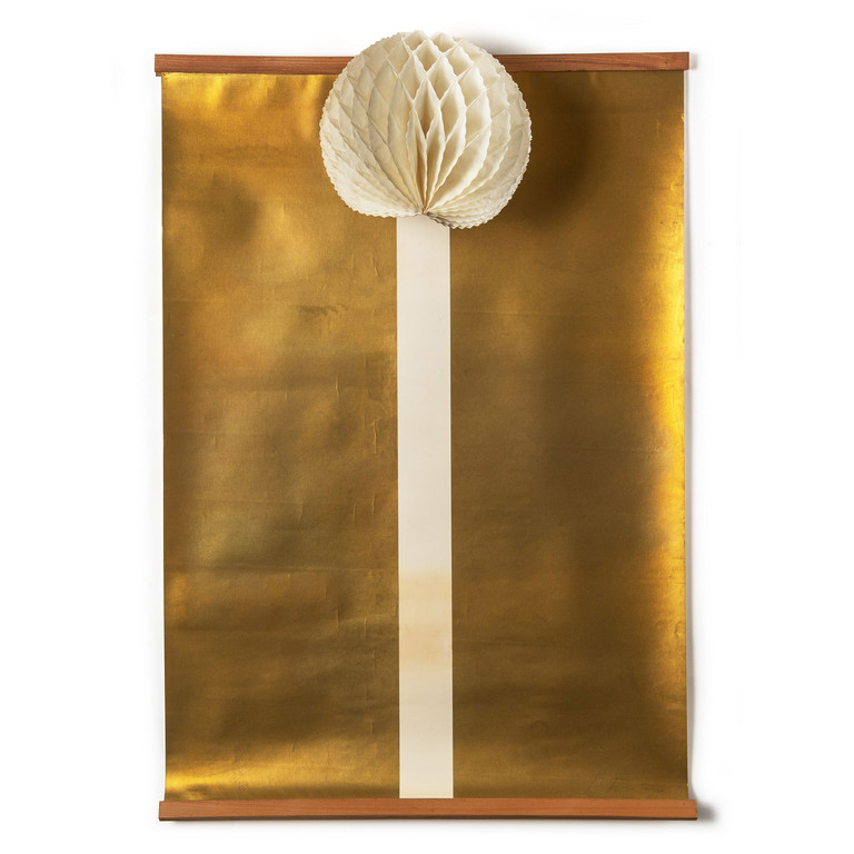 serigrafia stampata in oro (con una striscia verticale nel mezzo) su carta Fabriano con oggetto in carta montato a metà dell'opera cm 99 5x68