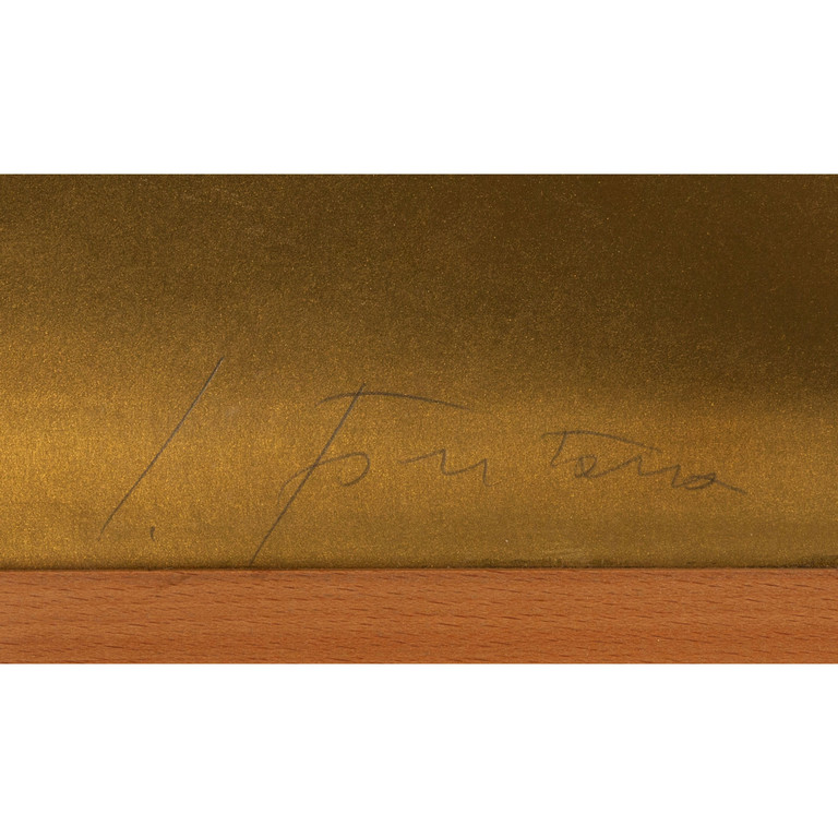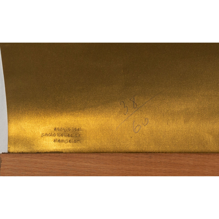silkscreen printed in gold (with a vertical stripe in the middle) on Fabriano paper with a white paper - object mounted in the middle of the print 39 17x26 77 in