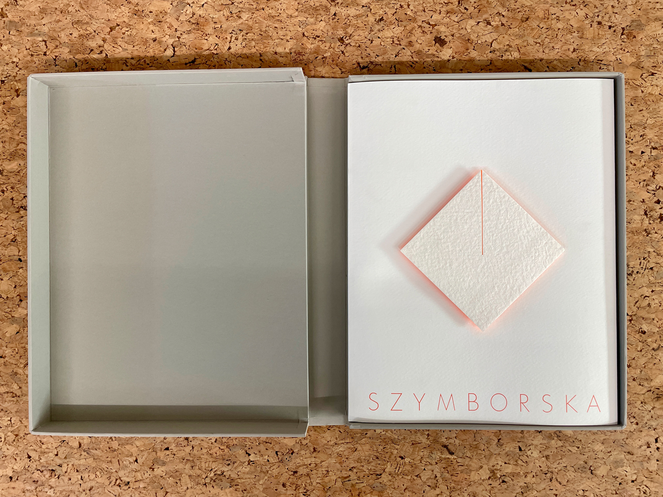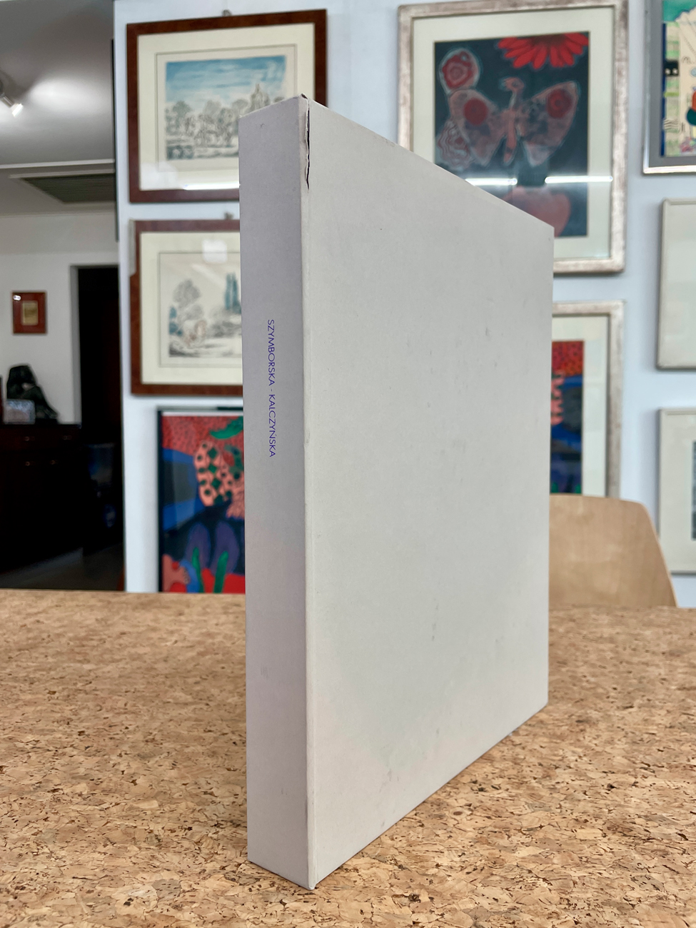 Splendida edizione d'arte, realizzata su carta Tintoretto neve, recante 12 poesie di Wislawa Szymborska, nella traduzione di Pietro Marchesani, illustrate da 3 acquerelli originali di Alina Kalczynska realizzati su carta Aquarelle Arches Grain fin da grammi 185, ciascuno dei quali recante timbro a secco dell'Artista