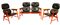 Divano e due poltroncine in legno laccato, seduta in compensato curvato rivestito in skai.
