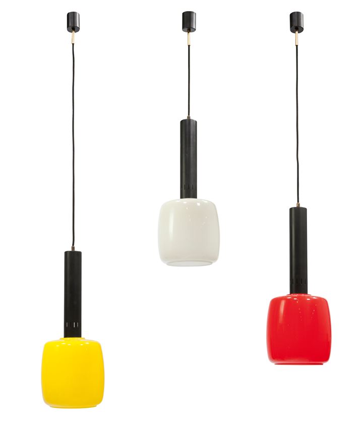 Tre sospensioni in metallo laccato, ottone e vetro colorato incamiciato.