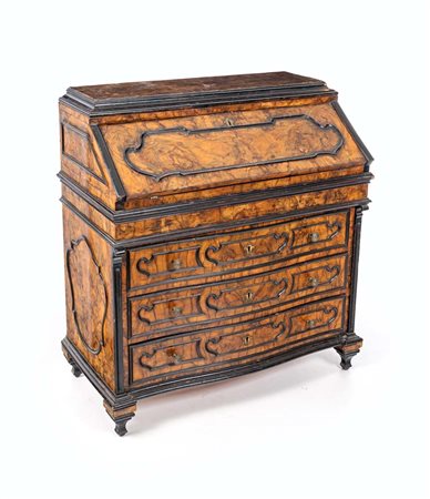 Cassettone a ribalta in radica di noce, Lombardia, XVIII secolo con cornici sagomate ed ebanizzate disposte a creare riserve sagomate; la ribalta ospita sei cassetti ed un ripiano scorrevole a celare un ampio scomparto interno; tre cassetti frontali delimitati da lesene ebanizzate, piedi a pilastro. Difetti cm 113x105x55 collezione Imperiali, Roma, discendenti duca Paolo Camillo Thaon di Revel e di Sant'Andrea, Duca del Mare, Torino
