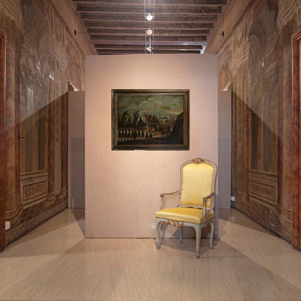 Lot 76 | Pittore del XVIII secolo - Accampamento militare olio su tela cm 71x46 - con cornice cm 85x110
