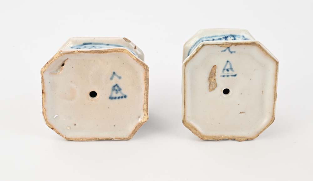 Coppia di saliere in maiolica bianca e blu, Savona, XVIII secolo a forma di piedistallo centrate da S cm 6x9x8