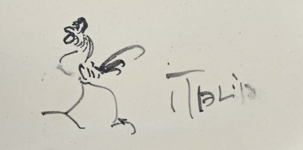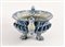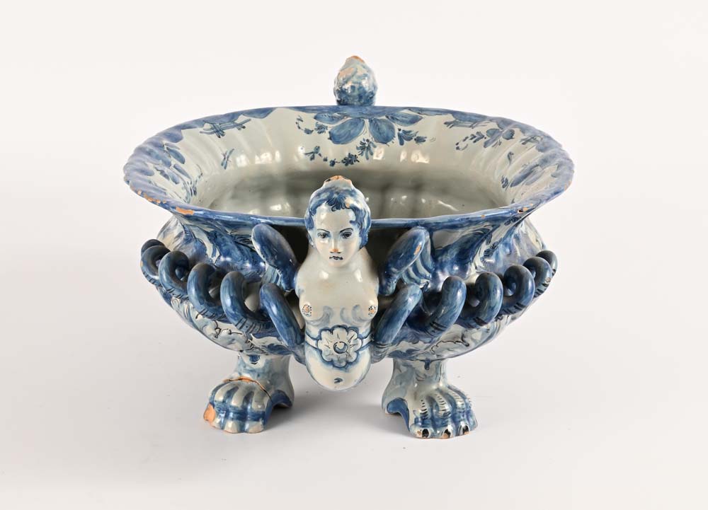 Grande centrotavola in maiolica, Cantagalli, Firenze, fine del XIX secolo di forma ovale con orlo sagomato e sorretto da piedi ferini, caratterizzato da figure plastiche di arpie; decorazione in monocromia blu su fondo celeste. Lievi difetti e rotture cm 19x48x30,5 Famiglia Imperiali, Roma, discendenti di Paolo Camillo Thaon di Revel e di Sant'Andrea, Duca del Mare, Torino