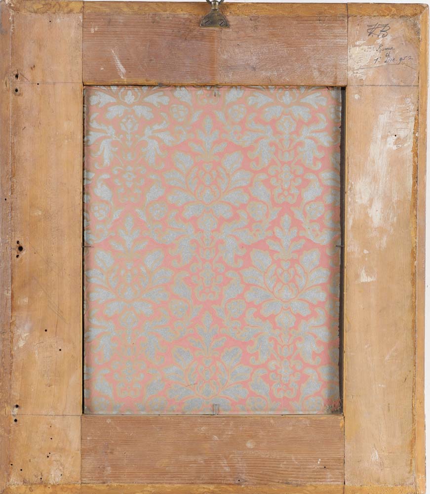 San Francesco in estasi Al verso, sull'angolo superiore destro della cornice, monogramma e data Roma 1 Dic. 952. Non esaminato fuori dalla cornice ricamo a fili incollati e acquerelli su seta cm 31x25 - in cornice cm 49x43