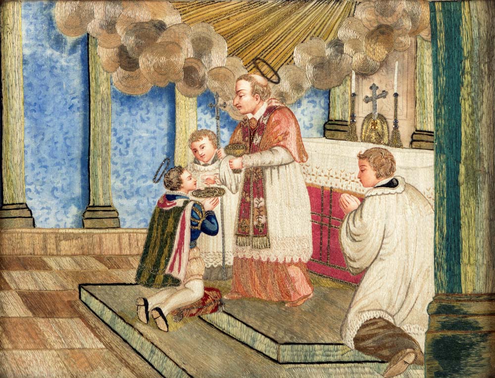 San Luigi Gonzaga riceve la prima comunione da San Carlo Borromeo cornice modanata in legno dorato. Non esaminato fuori dalla cornice ricamo a fili incollati e acquerelli su seta cm 30x40 - in cornice cm 43x52