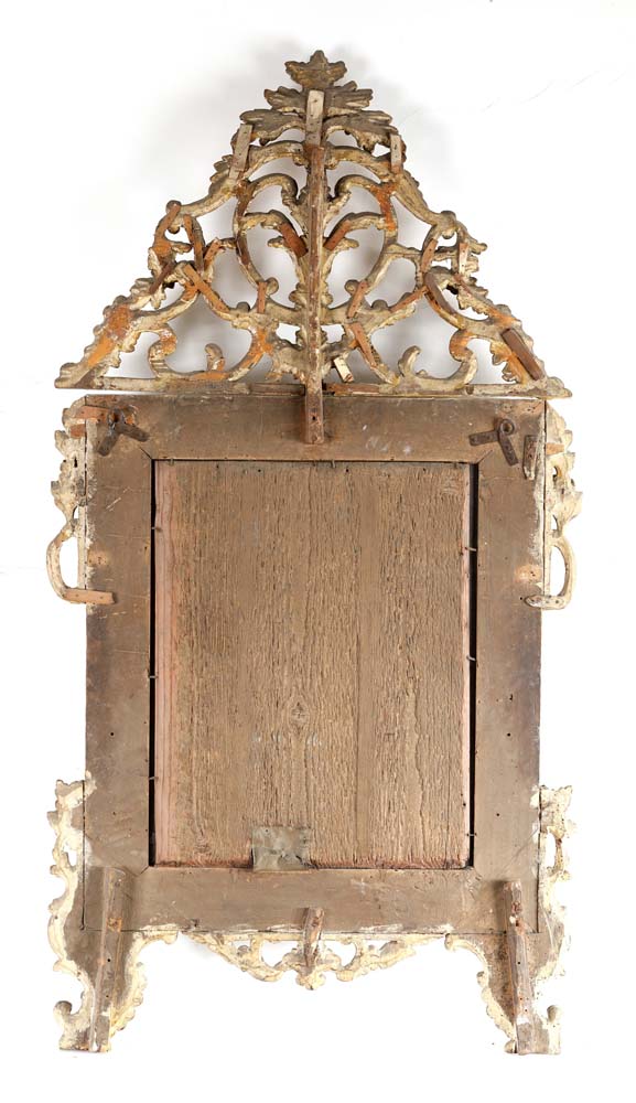 Specchiera in legno dorato, Piemonte, XVIII secolo di forma rettangolare racchiusa da due ordini di cornici intagliate, è sormontata da un'alta cimasa con cespo centrale affiancato da volute contrapposte dalla cui sommità si dipartono cascatelle; analoghi elementi decorativi rifiniscono la parte inferiore, piedi in forma di cartiglio. Difetti cm 170x90 collezione Imperiali, Roma, discendenti duca Paolo Camillo Thaon di Revel e di Sant'Andrea, Duca del Mare, Torino