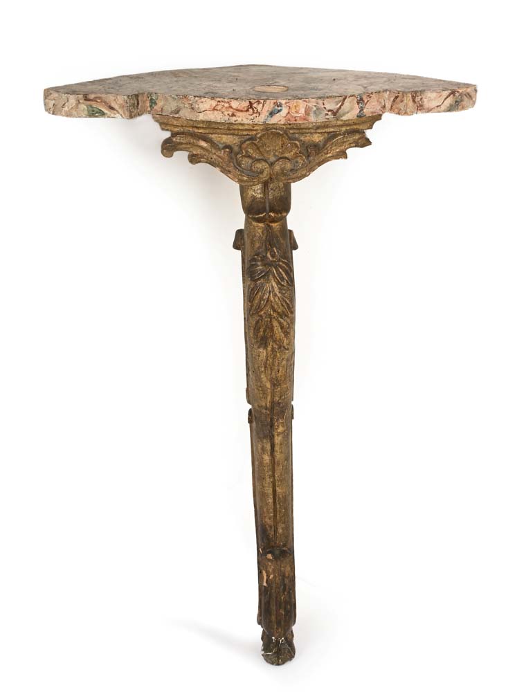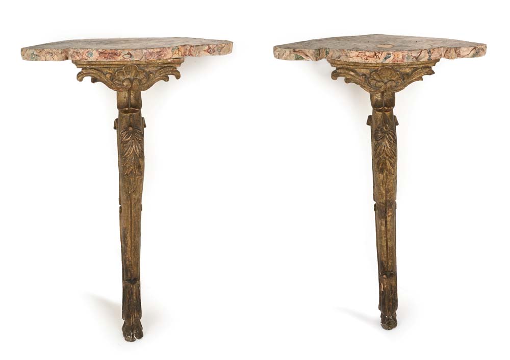 Coppia di piccole console ad angolo in legno dorato, Italia centrale, fine XVIII/inizio XIX secolo piani sagomati decorati ad imitazione del marmo, sostegno centrale sagomato impreziosito da rilievi vegetali intagliati cm 88x58x41