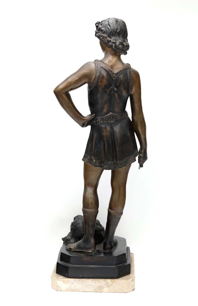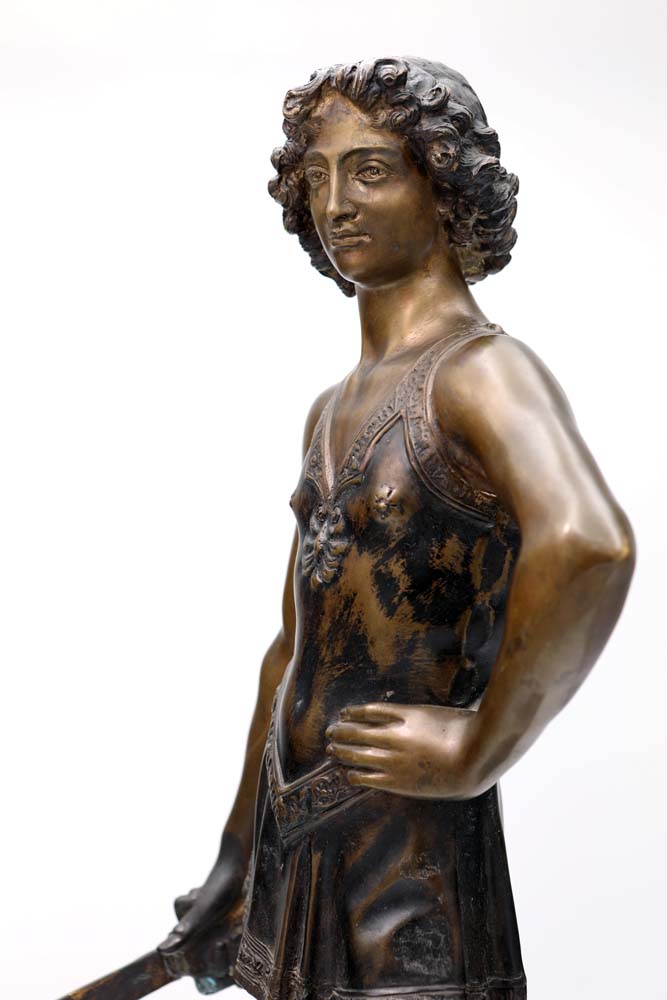 David (da Andrea del Verrocchio) Il giovane Davide è ritratto in abiti da paggio cortese; la spada nella mano destra ed il braccio sinistro piegato appoggiato in vita in posa fiera; ai suoi piedi la testa del gigante Golia bronzo altezza cm 64