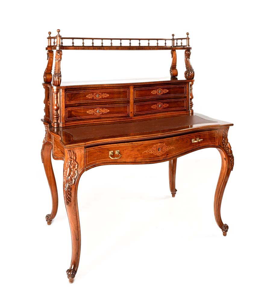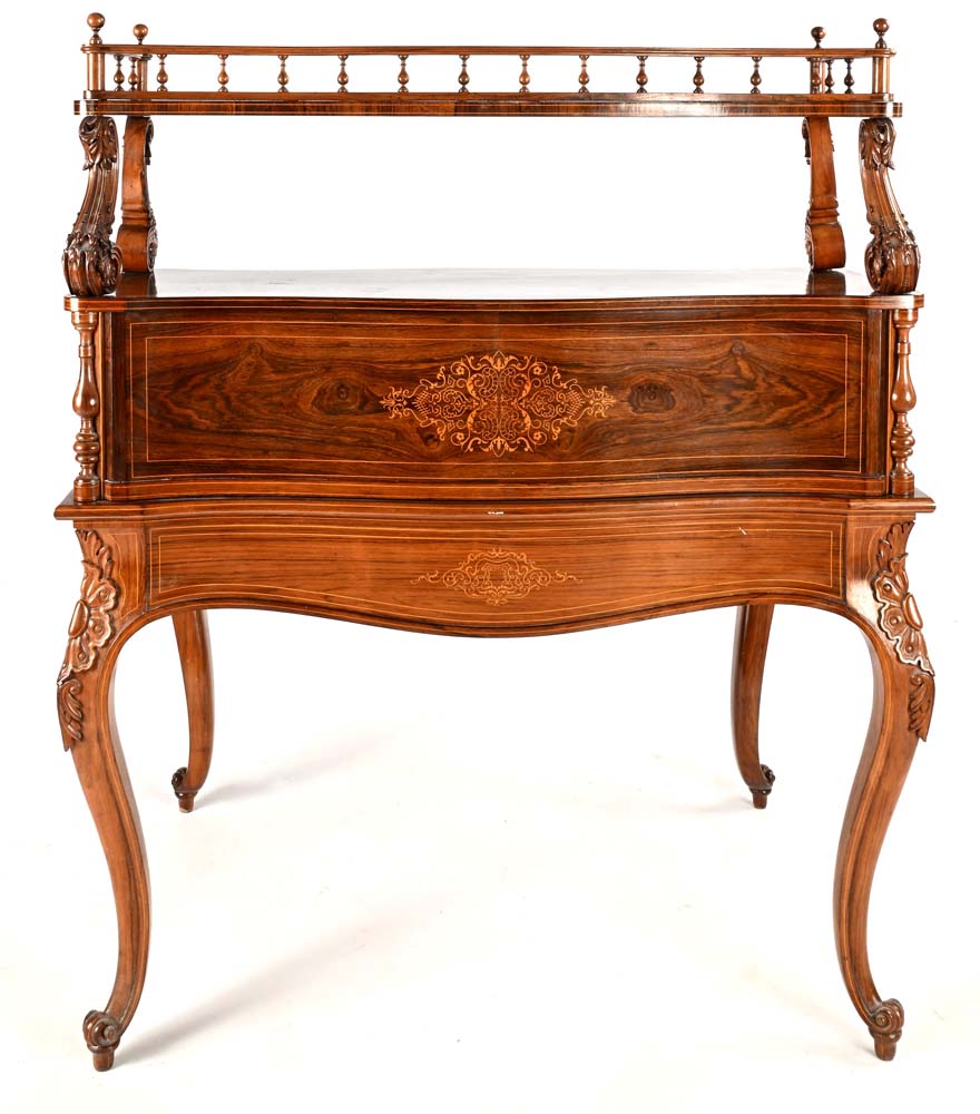 Scrittoio da centro con alzata con filettature ed intarsi, prima metà del XIX secolo piano sagomato rivestito in pelle sormontato da un'alzata con quattro cassetti ed un ripiano racchiuso da ringhierina a balaustrini; fascia di linea sagomata comprendente un cassetto, gambe mosse terminanti a ricciolo, decorate all'attaccatura da grandi corolle intagliate in bassorilievo cm 143x115x75