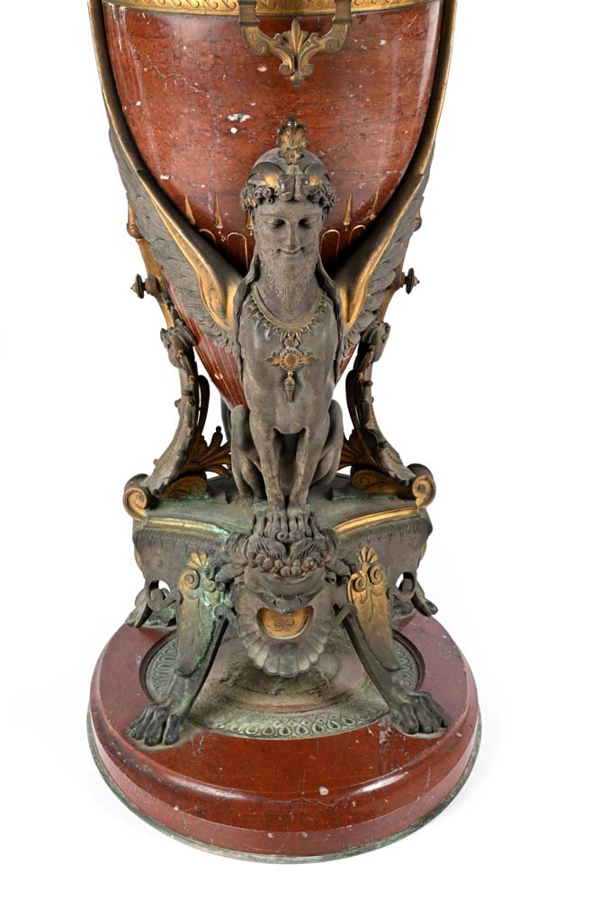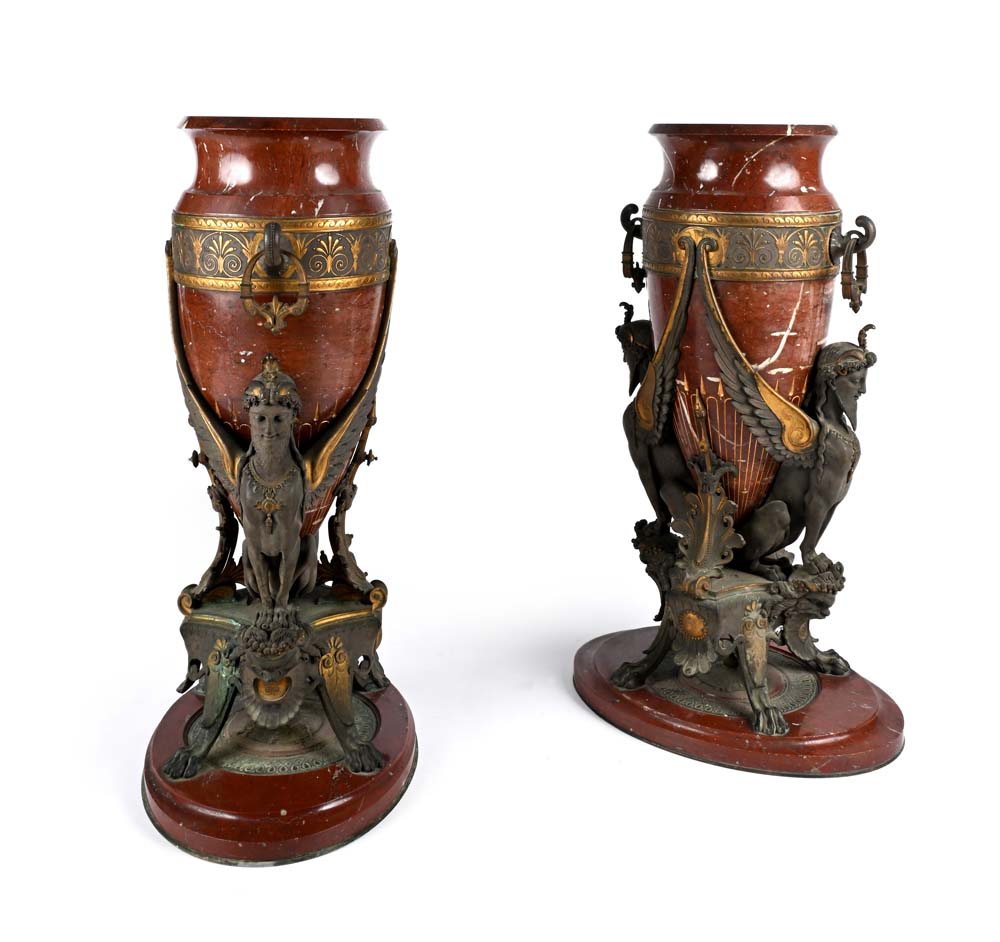 Coppia di vasi in marmo rosso e bronzo d'epoca umbertina caratterizzati ognuno da due figure di sfinge maschile in bronzo lumeggiato in oro, le cui ali avvolgono e fungono da sostegno; la parte superiore del vaso è ornata da una fascia percorsa da palmette; ai lati brevi anse ad uncino da cui pende una ghirlanda. Piedistallo quadrilobato con piedi ferini, base ovale in marmo rosso cm 71x40x25