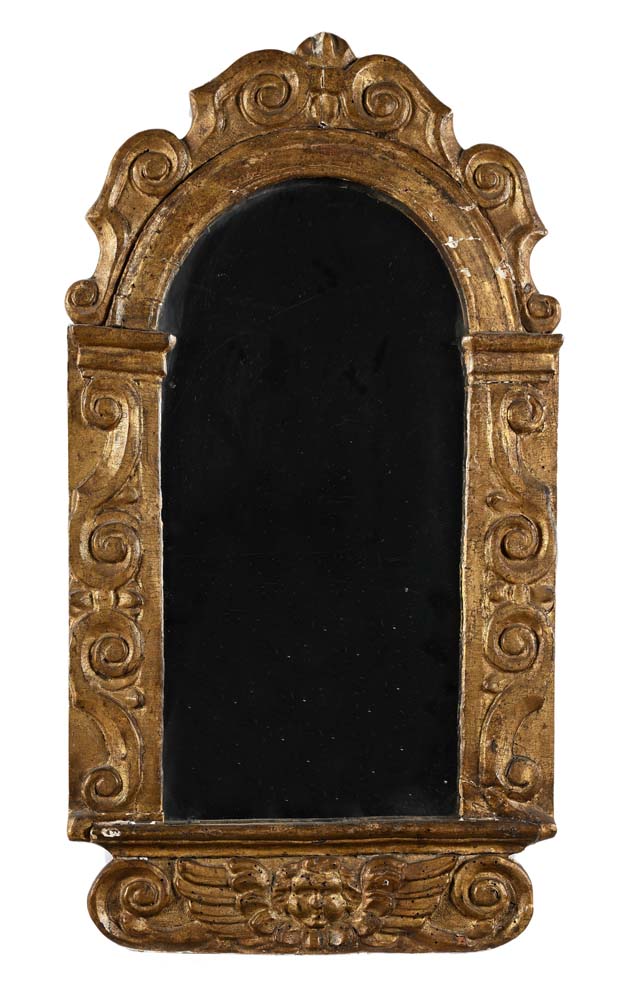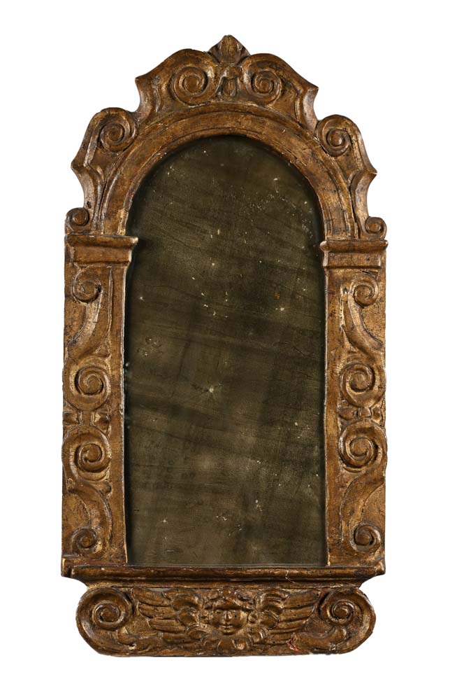 Coppia di specchierine in legno dorato, XVII secolo cornice centinata di impostazione architettonica percorsa da volute intagliate; il profilo inferiore caratterizzato da una testa di cherubino ad ali spiegate cm 72x38