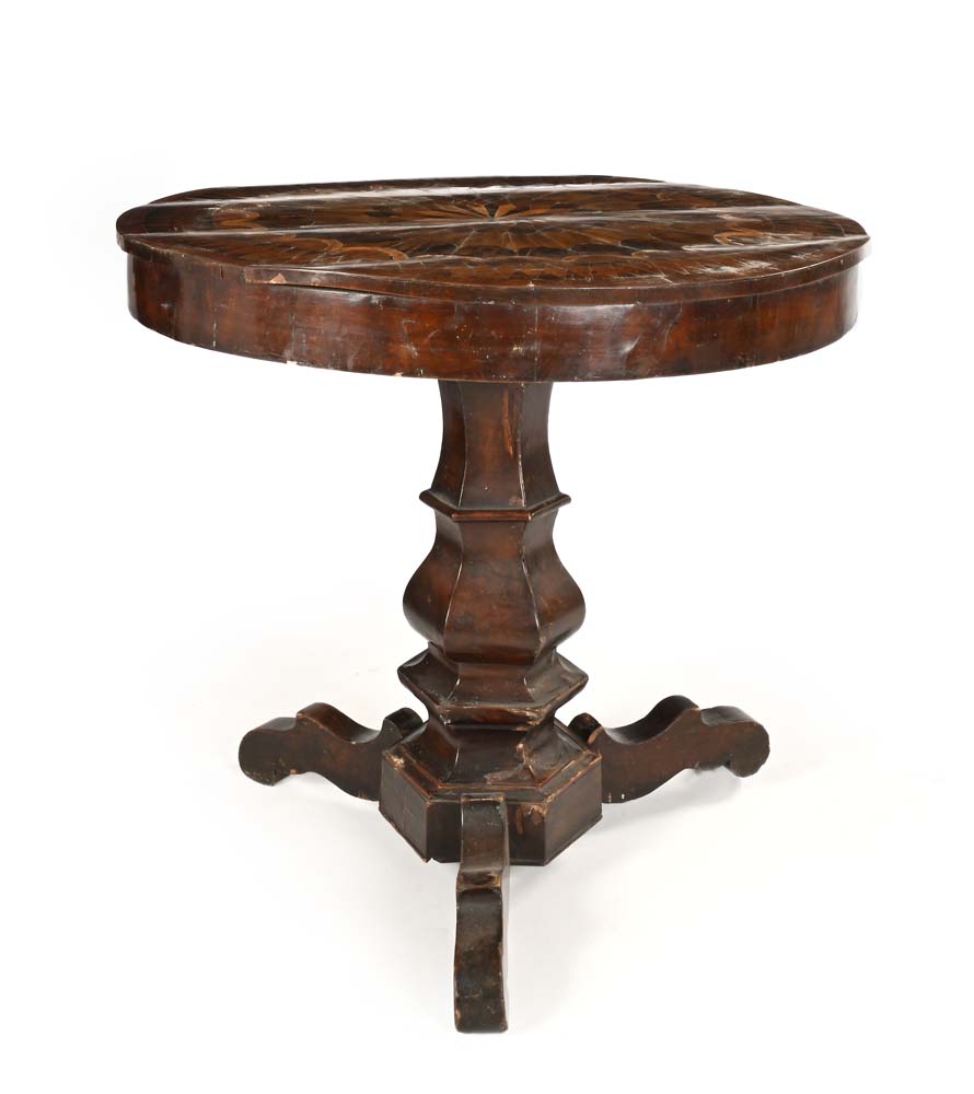 Tavolo circolare in legno intarsiato, XIX secolo piano centrato da stella circondata da archi continui; sostegno a balaustro poliedrico, tre piedi sagomati. Difetti cm 74x90