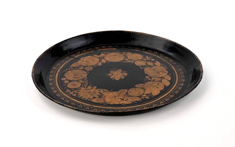 Vassoio circolare in latta dipinta, Inghilterra, XIX secolo decorato da una ghirlanda di fiori dipinta in oro su fondo nero. Lievi difetti diametro cm 31,5