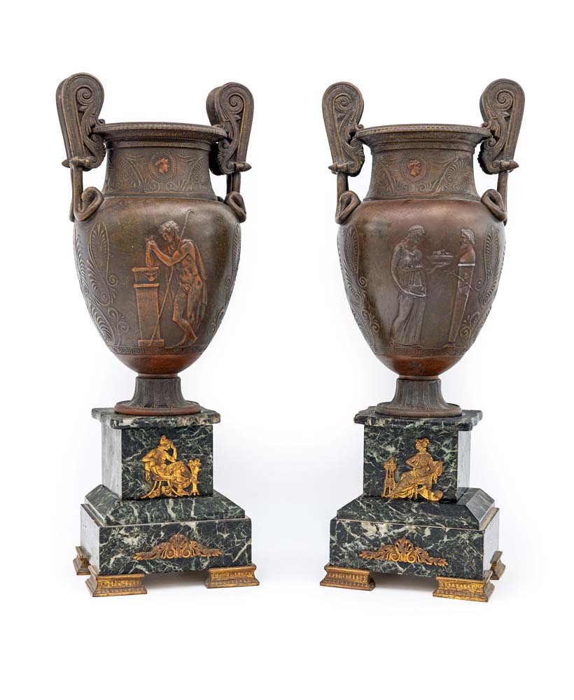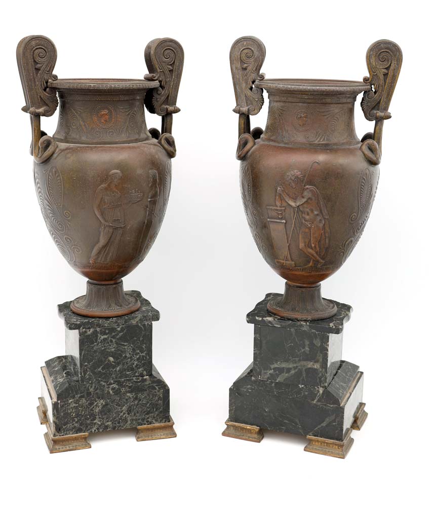 Coppia di vasi in bronzo del Grand Tour, XIX secolo desunti dall'antico recano corpo ad anfora biansata ornato da figure classiche in rilievo, piedistallo squadrato in marmo con applicazioni ornamentali in bronzo cesellato e dorato. Lievi rotture ai marmi