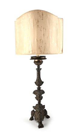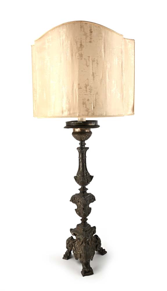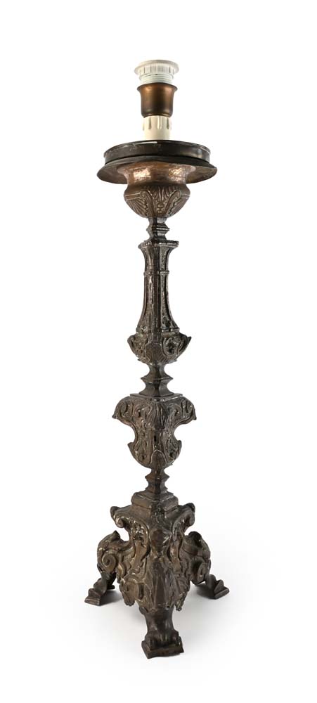 Torciera in legno rivestito di metallo sbalzato a motivi vegetali, XVIII secolo altezza cm 56 - altezza complessiva cm 95