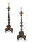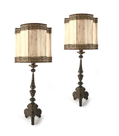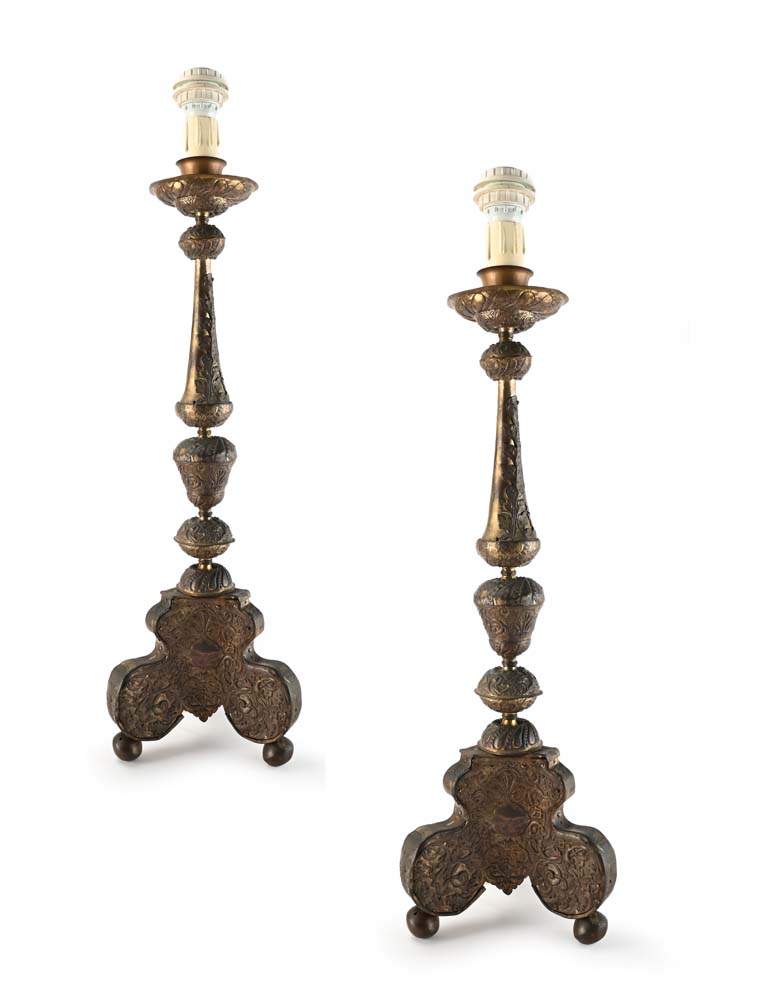 Coppia di torciere rivestite in metallo, XVIII secolo trasformate in lampada;...