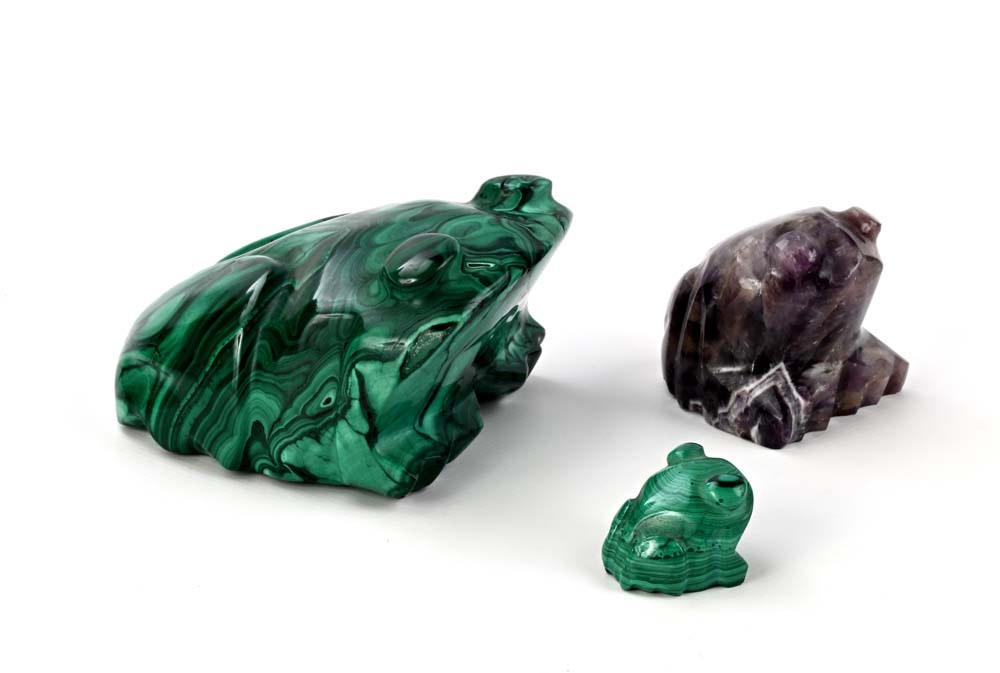 Tre rane in pietra dura, XX secolo due di malachite (cm 3x3x3,5 e cm 7x10x13) ed una di amestista (cm 5,5x6x6) misure diverse