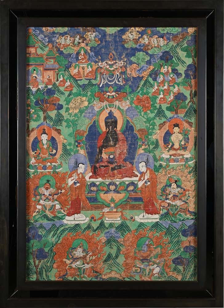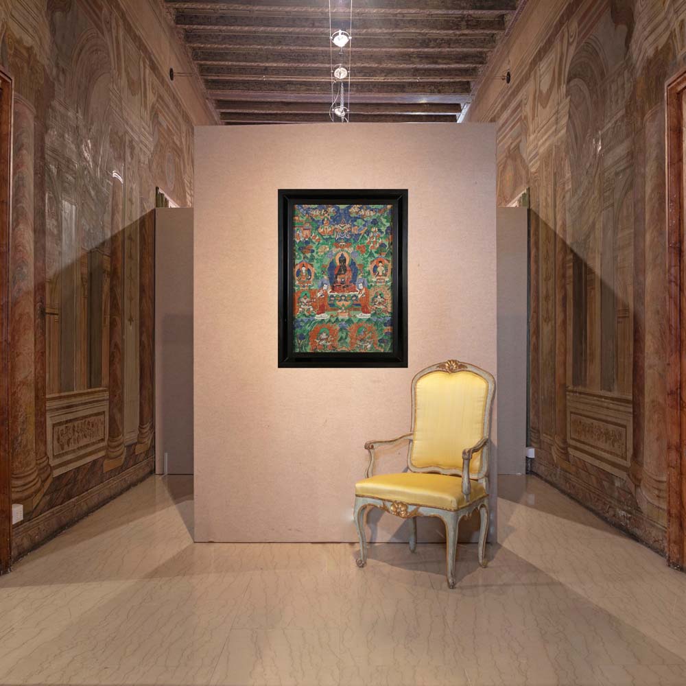 Antico thangka tibetano raffigurante Amitabha Buddha in trono a fior di loto con la ciotola delle offerte tra le mani, raffigurato in un ambiente montano con corsi d'acqua e fiori, circondato da personaggi religiosi. Lievi difetti. Non esaminato fuori dalla cornice tempera su tela applicata su tavola cm 85x58 - in cornice cm 103x76