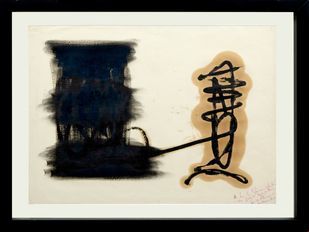 Georges Mathieu, Senza Titolo, 1951, Tecnica mista su carta, 48x66 cm, Firma al verso, Timbro Galleria del Milione - Milano, Dedica datata '51 al recto a Peppino Ghiringhelli (Galleria il Milione - Milano), Cornice in omaggio