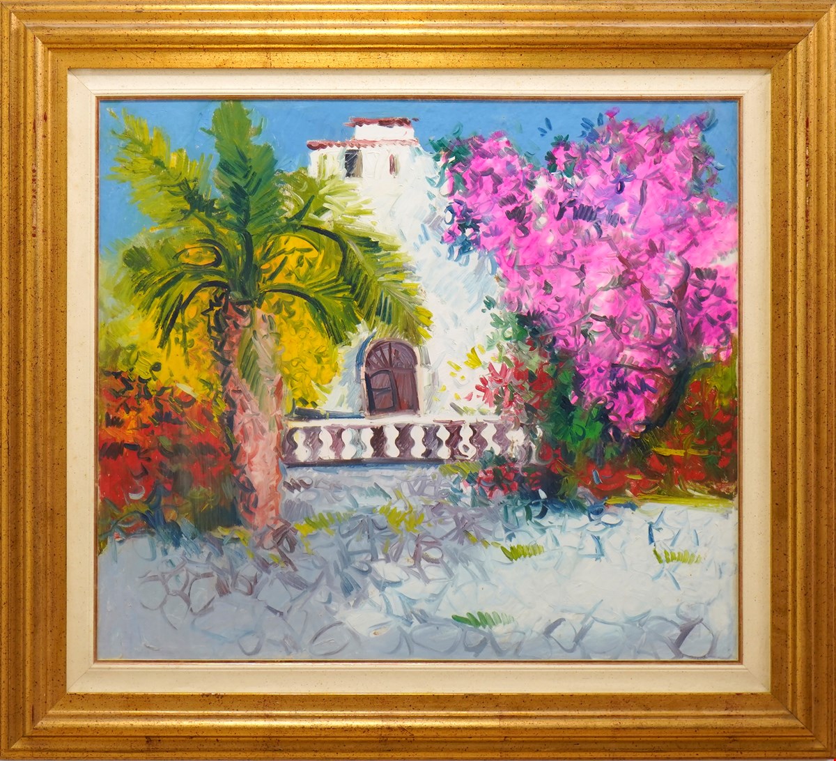 Athos Faccincani, La Loggia, 1984, Olio su tela, 70x80 cm, Pubblicazione sul Catalogo 'Athos Faccincani' - Viola edizioni d'arte, pag. 212, Firma e Datazione al verso, Cornice in omaggio