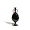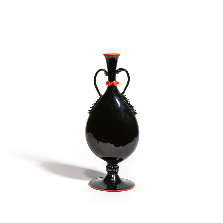 Un vaso ad anforetta in vetro nero con orli corallo.