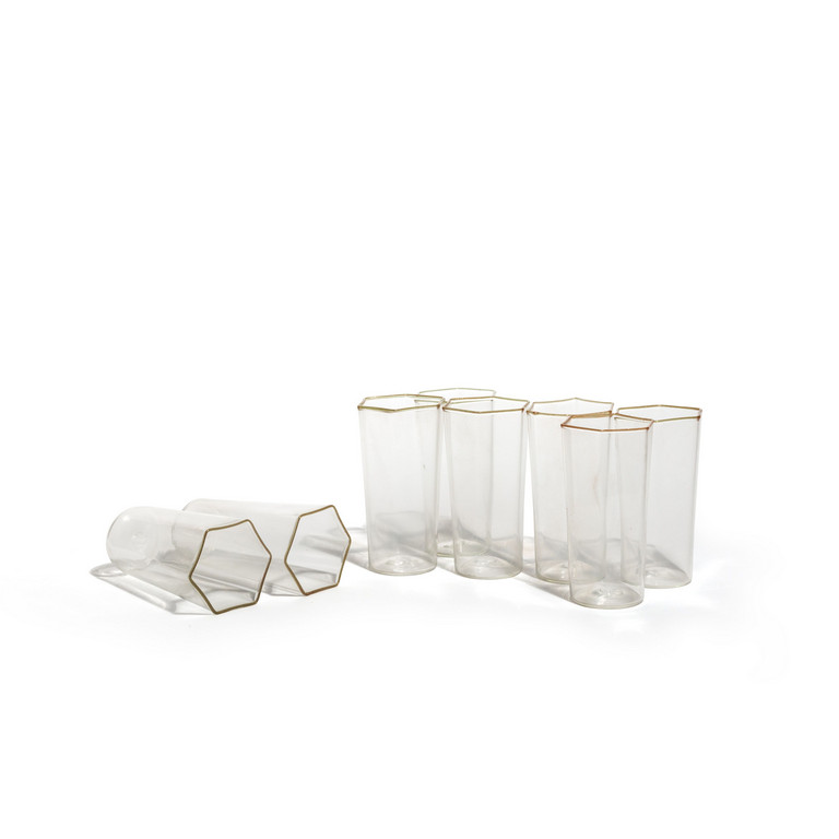 Un gruppo di otto bicchieri esagonali in cristallo con bordo di avventurina.