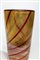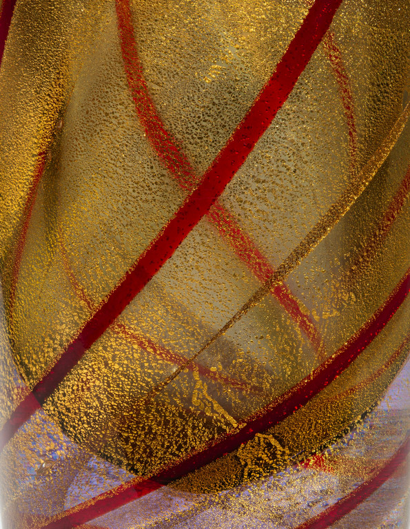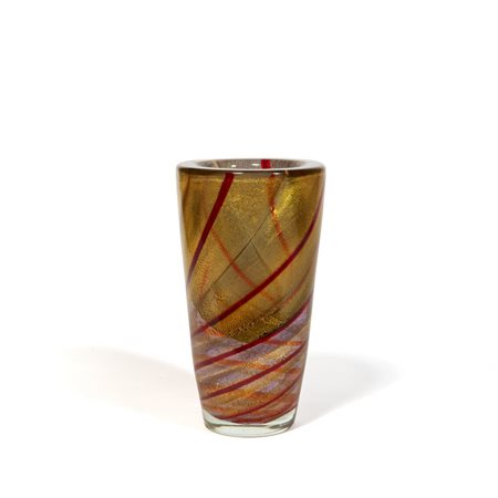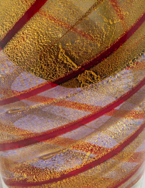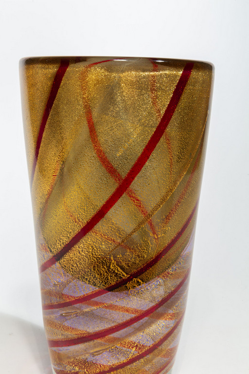 Un vaso in vetro pesante con decoro di canne ritorte ametista e foglia oro.