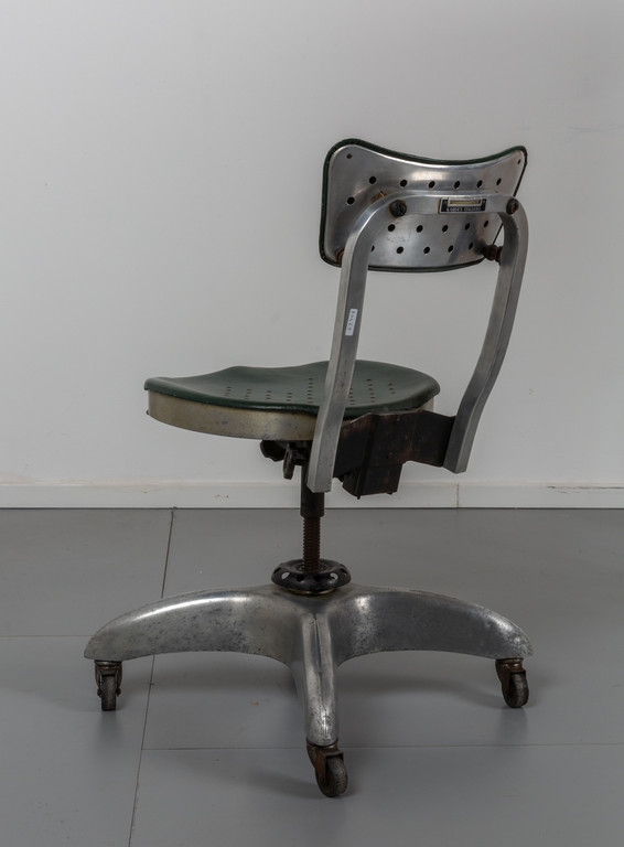 Cast aluminum steel shaped and perforated seat and backrest lightly padded covered in vinyl leather.
