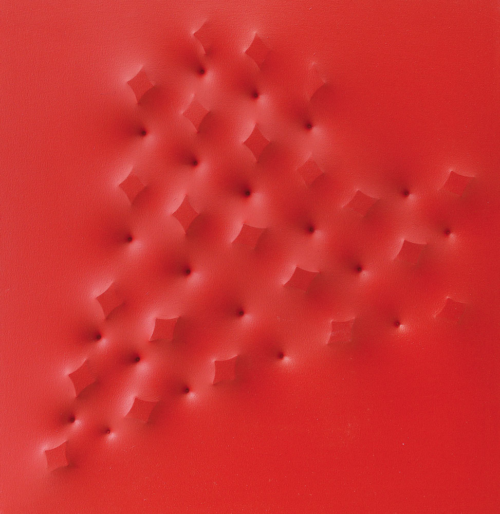 tela estroflessa rossa cm. 53x52x4, firma e titolo al retro, dichiarazione d'autenticità dell'artista su foto, opera priva di cornice.