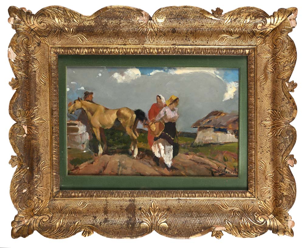 Alfredo Del Sordo Otranto 1905 - Roma 1961 contadini in campagna con cavallo all'abbeveratoio Firmato: 'A Del Sordo' in basso a destra. olio su masonite cm 25 x 42 - in cornice cm 50 x 60