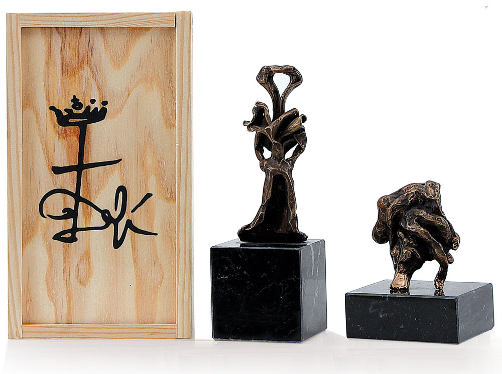 coppia di sculture in bronzo poggianti su base in marmo altezza cm. 17,5 e 10, opere non firmate, esemplari numerati 1837 e 418 impressi nel bronzo, certificati d'autenticità di 2049 Obra Contemporanea Editor (Spagna) allegato, una custodia in legno.