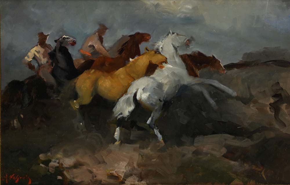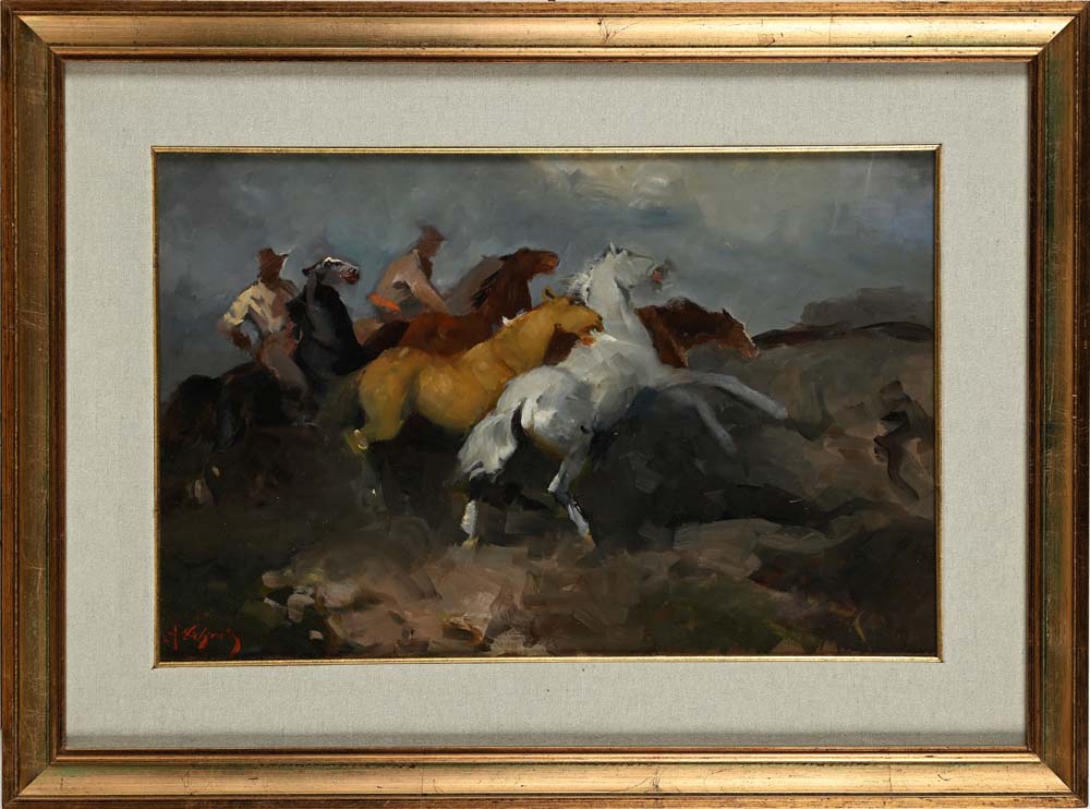 Alfredo Del Sordo Otranto 1905 - Roma 1961 Butteri e cavalli al galoppo Firmato: 'A del Sordo' in basso a sinistra. olio su masonite cm 33 x 50,5 - in cornice cm 50 x 68