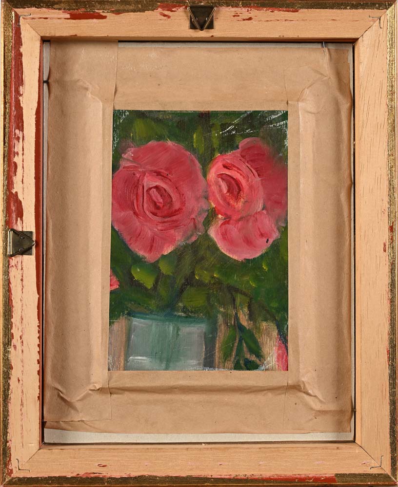 Sul retro altro dipinto di mano dell'artista raffigurante 'due rose in un vaso'. olio su legno cm 17 x 12 - in cornice cm 29 x 23,5