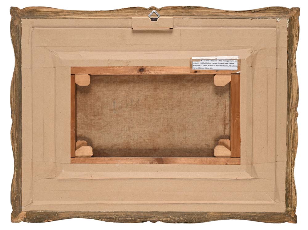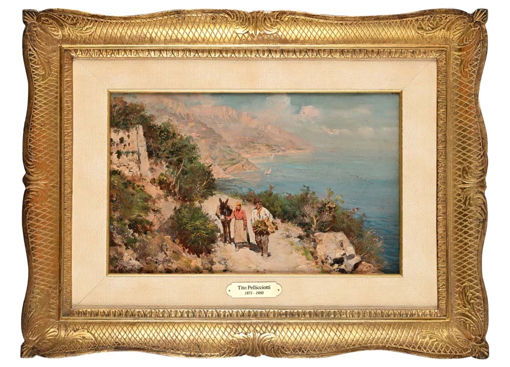 Tito Pellicciotti Barisciano 1871 - Barisciano 1950 Coppia di contadini su una strada lungo la costiera Firmato in basso a destra: 'T. Pellicciotti'. Olio su tela cm 25,5 x 40,5 - in cornice cm 46 x 61