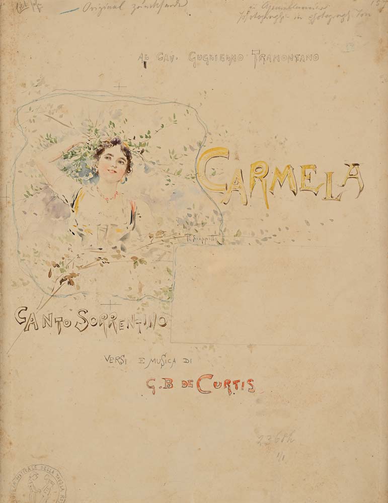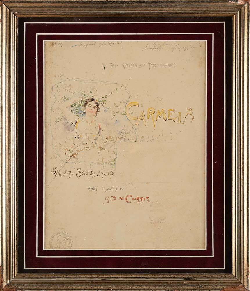 Si tratta del bozzetto per la copertina dell'omonimo spartito musicale di G.B. de Curtis. Matita e acquerello su cartoncino cm 30,5 x 23,8 - in cornice cm 43 x 36,5